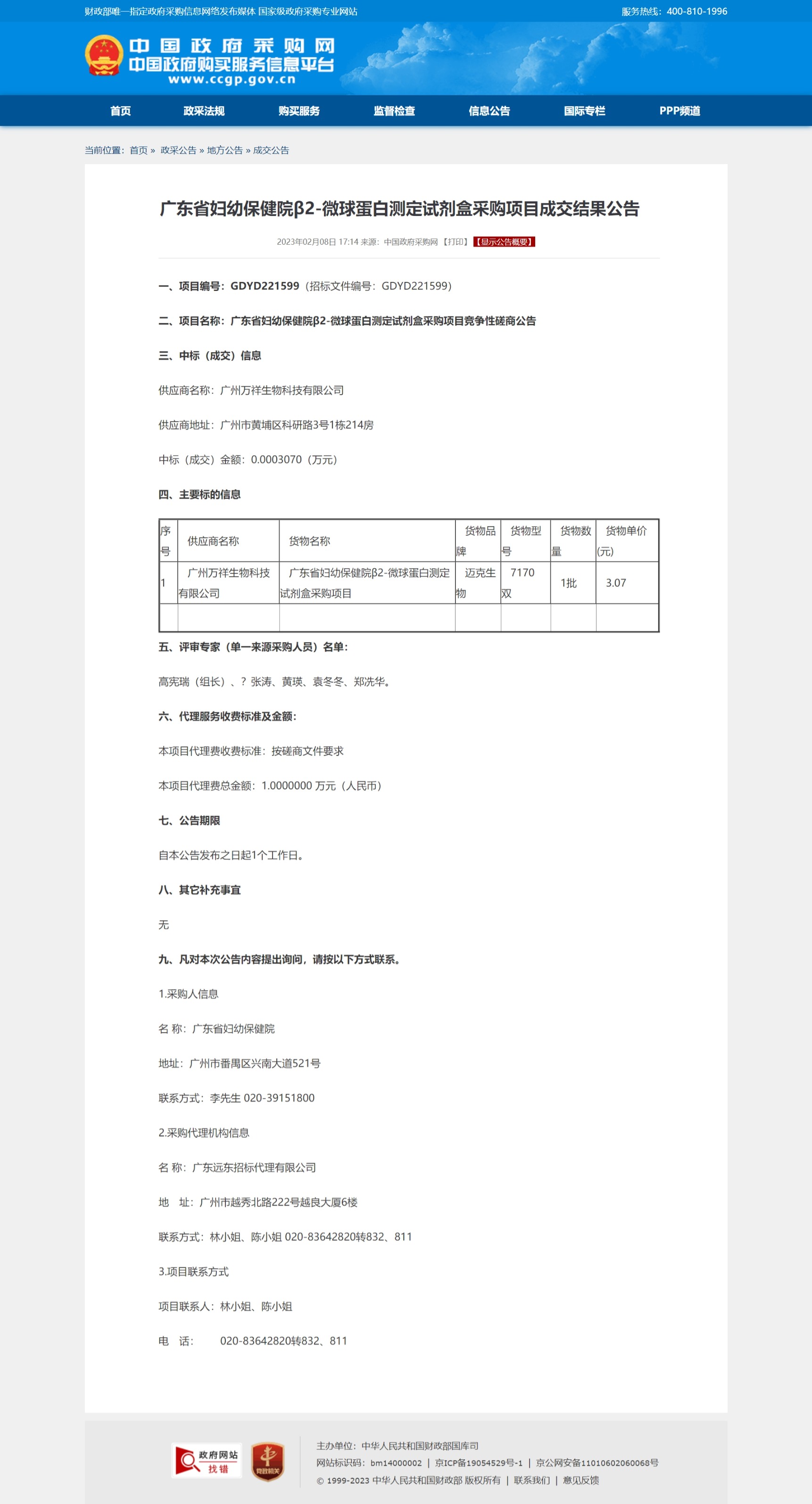广东省妇幼保健院β2-微球蛋白测定试剂盒采购项目 |
