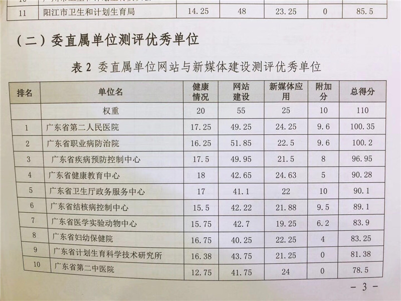 此次测评由省卫计委组织开展,旨在一步加强全省卫生计生系统网站与新媒体建设,提升信息公开、新媒体应用、互动交流和便民服务的能力。省卫计委根据测评方案对广东省内21个地级以上市卫生计生局(委)、19个委直属单位、全省各地78个三级综合医院和17个三级专科医院共135个单位进行测评。测评内容包括健康情况、网站建设与应用、新媒体建设与应用和附加指标四个方面,广东省妇幼保健院测评总分名列前茅,获“优秀单位”称号。