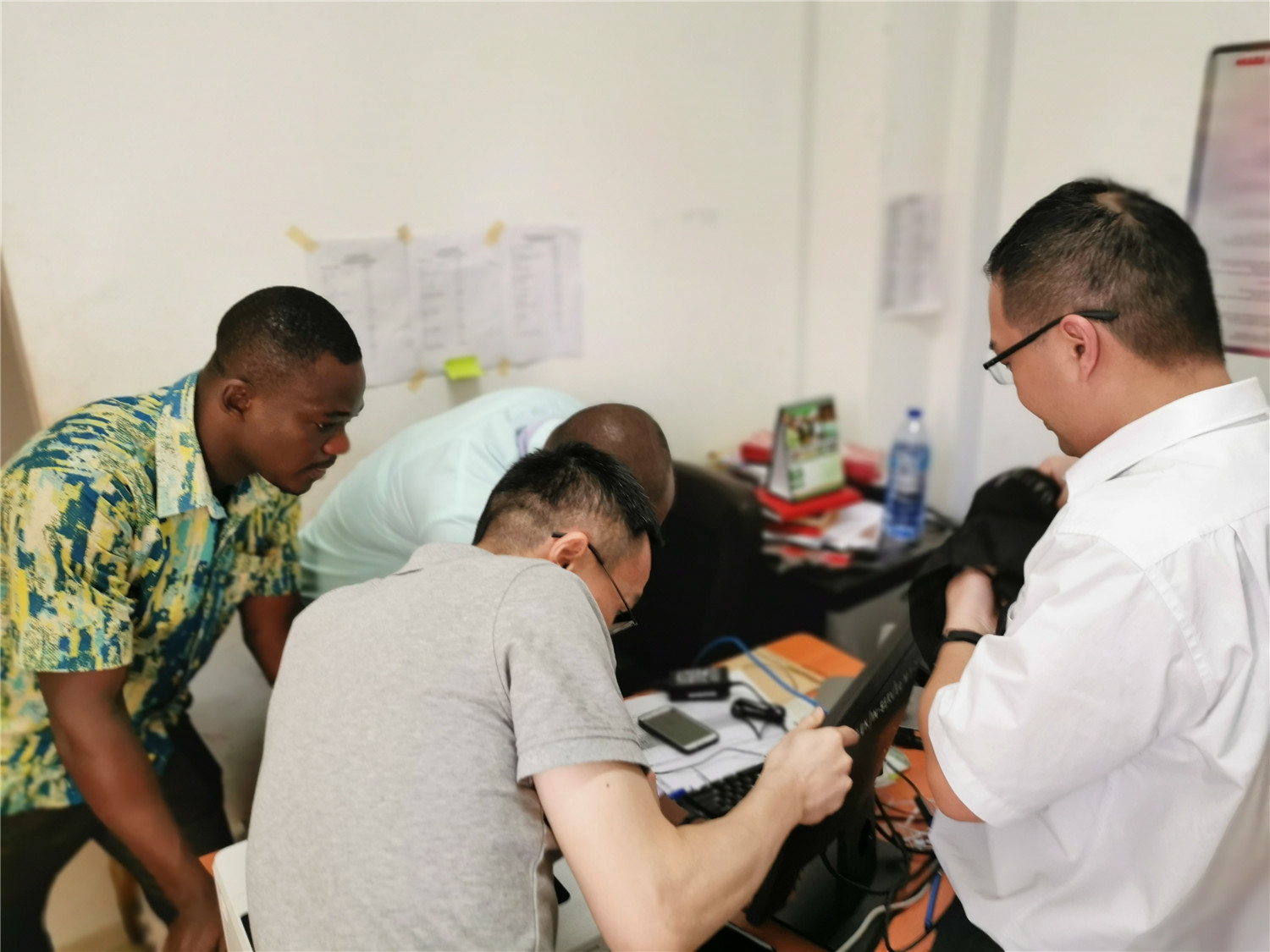 本次援助加纳,其中一项工作任务是在调研当地的网络条件及信息化程度后,搭建中加远程会诊平台。援助小组认真研究制定工作方案。在当地时间2019年5月10日,苏晓舟科长和赖志存副科长与LEKMA医院IT工程师沟通后,用LEKMA医院的INTERNET网络线路进行远程会诊测试和培训。经过测试,用LEKMA医院INTERNET有线外网环境下会诊时的视频和音频丢包率达到40%-70%。为保证在LEKMA医院新生儿科建设一个完整可用的远程会诊场所,援助组队长韦相才副院长决定不等不靠,在加纳当地为LEKMA医院配置了一台24寸电视、一台UPS、4G无线路由器及相应流量包。